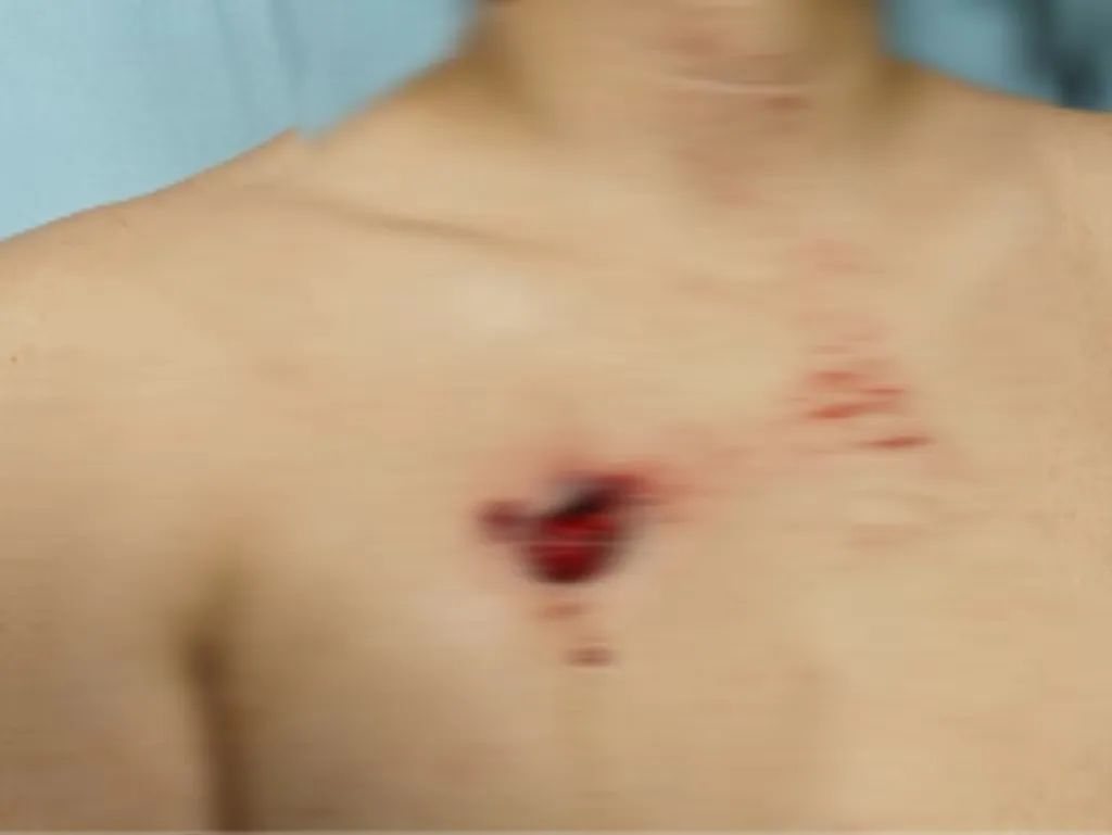 “医生我这肚子上打了个洞!”9月22日早上八点多抢救室来了个中年男子王先生(化名),捂看肚子,掀开纱布只见一个灼烧样的红色血洞。CT检查后,急诊外科医生曾云鹏对他说:“再多1毫米,就要穿过腹膜伤到肠子了!现在是损伤了腹直肌,穿透了腹壁。”