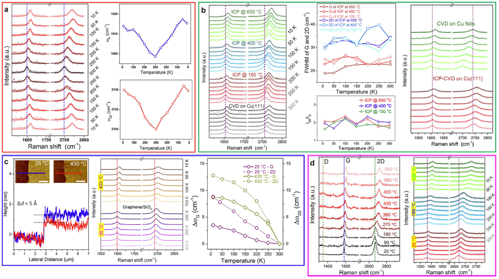 文章中对样品进行了高质量的变温Raman测量,清晰的展示了不同制备与处理条件的石墨烯G峰和2D峰随温度变化的峰位移动。揭示了石墨烯与衬底之间相互作用的强弱以及石墨烯受到的应力大小。
