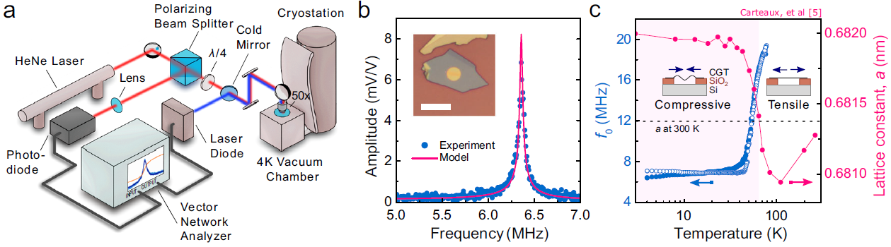 用激光干涉法表征CGT膜;a)光路示意图,样品置于Montana恒温器内;b)4K温度下样品的共振峰测量值和理论拟合值;c)不同温度下样品共振峰的变化与晶格常数的变化。3