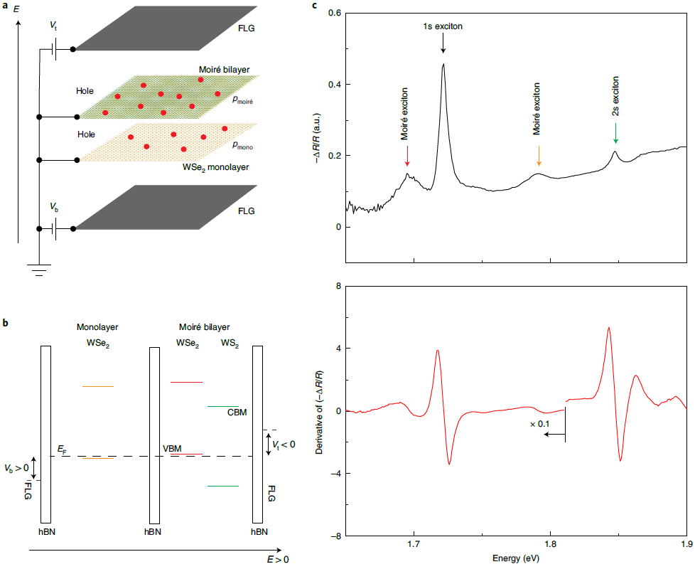 由WS2/WSe2莫尔双分子层和WSe2单分子层组成的双层异质结示意图与反射率测量。2