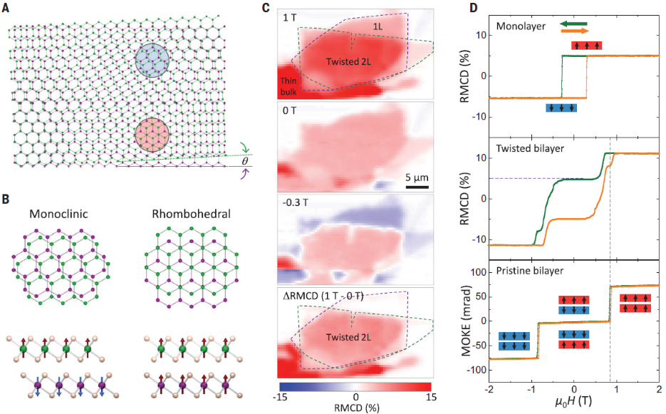 扭曲非磁性二维材料形成的莫尔超晶格是研究奇异相关态和拓扑态的高度可调控系统。近些年来在旋转石墨烯等多种二维材料中都观察到了很多奇异的性质。有鉴于此,来自华盛顿大学的许晓栋教授课题组报道了在小角度扭曲的二维CrI3中出现的磁性纹理。作者利用基于NV色心的量子磁强计直接可视化测量了纳米尺度的磁畴和周期图案,这是莫尔磁性的典型特征。该篇文章中研究者利用MOKE和RMCD(反射磁圆二色性)对样品的磁性进行了精细的测量。研究表明,在扭曲的双分子层CrI3中反铁磁(AFM)和铁磁(FM)域共存,具有类似无序的空间模式。在扭曲三层CrI3中具有周期性图案的AFM和FM畴,这与计算得到的CrI3莫尔超晶格中层间交换相互作用产生的空间磁结构相一致。本文的研究结果表明莫尔磁性超晶格可以作为探索纳米磁性的研究平台。