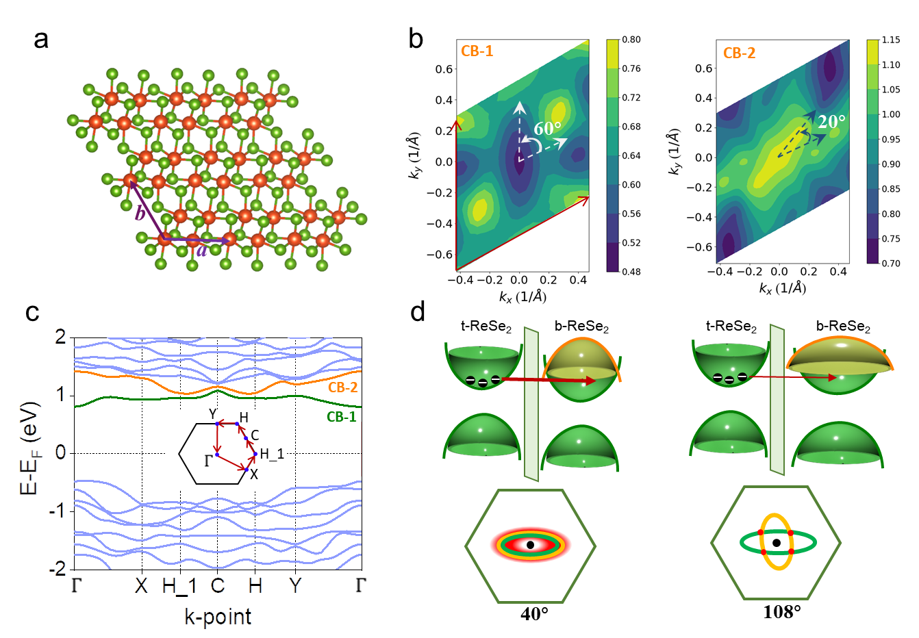 图1展示的基于1T’-ReSe2的各向异性共振隧穿效应。图a展示了1T’-ReSe2的原子结构俯视图,展示了各向异性的晶格方向。图b展示了计算得到的第一导带(CB-1,左)和第二导带(CB-2,右)的能带图,显示了强烈的面内各向异性。图c 展示了单层ReSe2的能带结构,显示导带最小值位于Γ点。图d 展示了ReSe2/h-BN/ReSe2 共振隧穿晶体管在40°(左上)和108°(右上)扭转角度下的能带对准示意图。108° 共振隧穿晶体管中的联合态密度(右下角红点)低于40°的(左下角红阴影)。