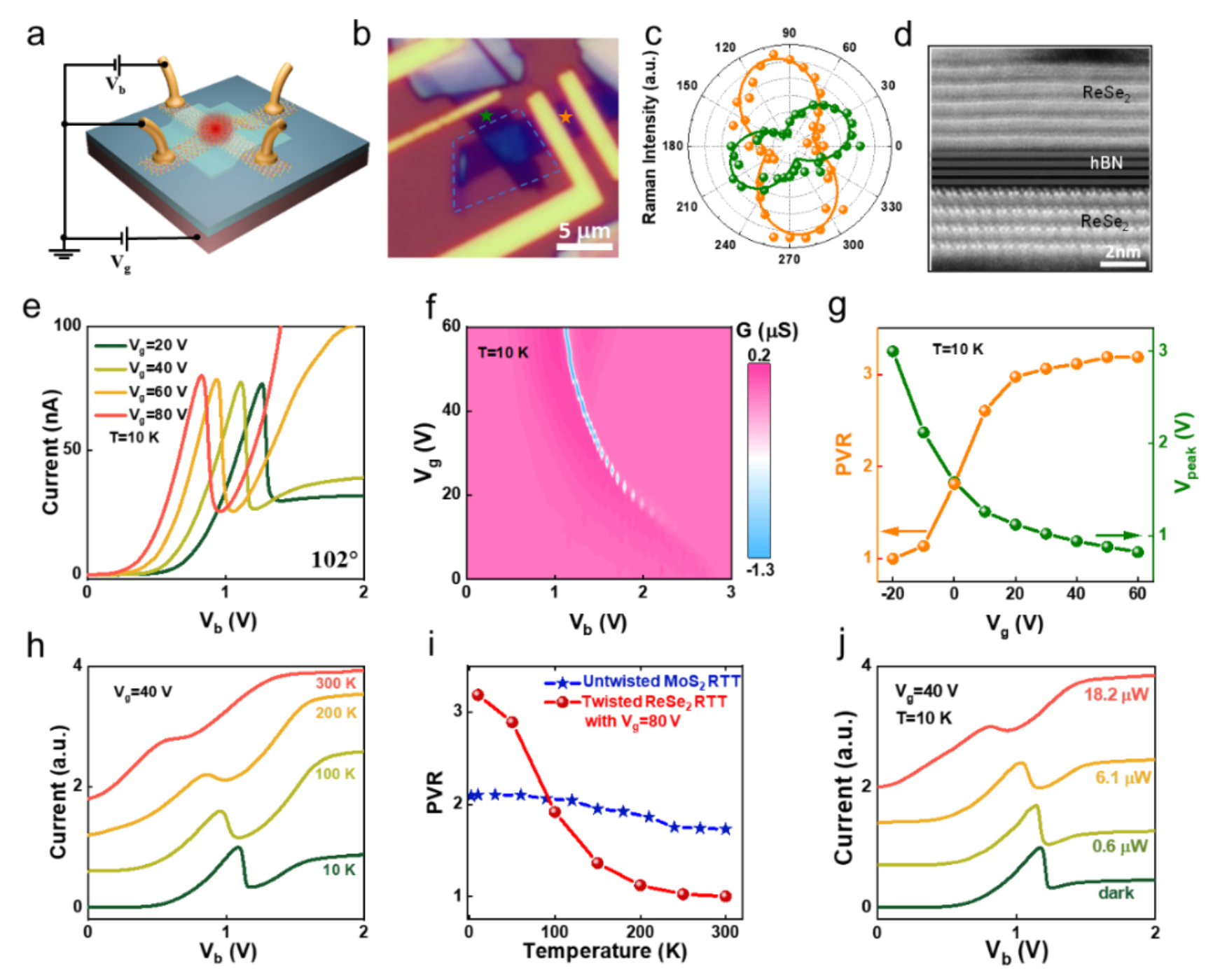 图2展示了102°扭曲堆叠共振隧穿晶体管中的负微分电阻。图a展示了ReSe2/h-BN/ReSe2 共振隧穿晶体管的示意图,其中偏置电压施加在底层ReSe2上,共振隧穿效应发生在重叠区域(红域所示)。图b展示了102° 共振隧穿晶体管的光学图像,橙色和绿色五角星表示拉曼测试的位置。两层ReSe2通过几层h-BN(蓝色虚线)分隔。图c展示了在拉曼位移127 cm-1处,顶部(橙色圆圈)和底部(绿色圆圈)ReSe2层的偏振依赖性拉曼强度。拟合线(橙色和绿色线°。图d展示了共振隧穿晶体管的TEM横截面图,显示两层ReSe2的相对晶格方向。图e展示了在不同栅电压下的隧穿电流与偏置电压的关系,清楚地展示了栅电压依赖的负微分电阻。图f展示了共振隧穿晶体管的电导图,显示了负微分电阻峰值随栅电压的变化趋势。图g展示了PVR和负微分电阻峰值位置随栅电压的变化总结。图h展示了栅电压Vg=40 V时不同温度下的隧穿电流与偏置电压的关系,显示出负微分电阻对温度敏感。图i展示了102°TS-RTT与基于单层MoS2的未扭曲共振隧穿晶体管之间的温度依赖PVR比较,未扭曲共振隧穿晶体管对温度几乎不具有依赖性。图j展示了在不同激光功率的520 nm光照射下的隧穿电流与偏置电压的关系,显示出负微分电阻对光照敏感。