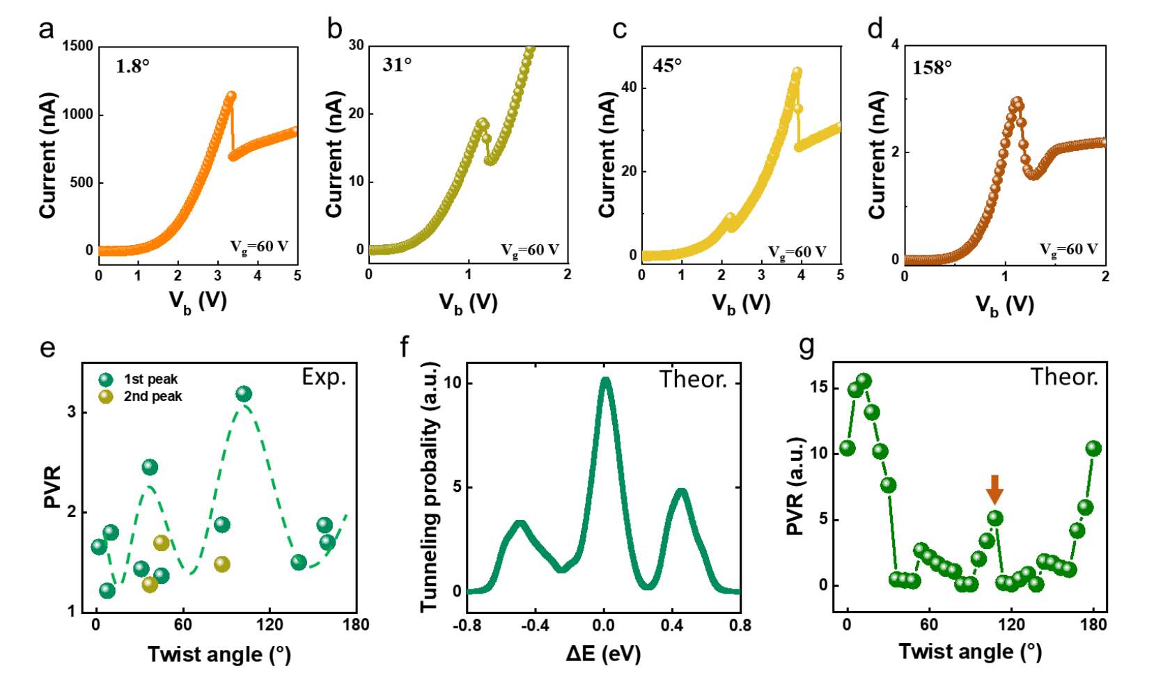 图4展示了不同扭转角度下的负微分电阻总结。图a-d展示了扭转角度为1.8°、31°、45°和158°时扭曲堆叠共振隧穿晶体管的隧穿电流与偏置电压的关系。图e展示了PVR随扭转角度变化的总结,显示在具有大扭转角度的扭曲堆叠共振隧穿晶体管中,PVR得到了增强(绿色虚线为参考线°扭转角度扭曲堆叠共振隧穿晶体管的隧穿概率随能量偏移的变化。图g展示了理论计算的PVR随扭转角度变化,与(e)中的实验结果一致。