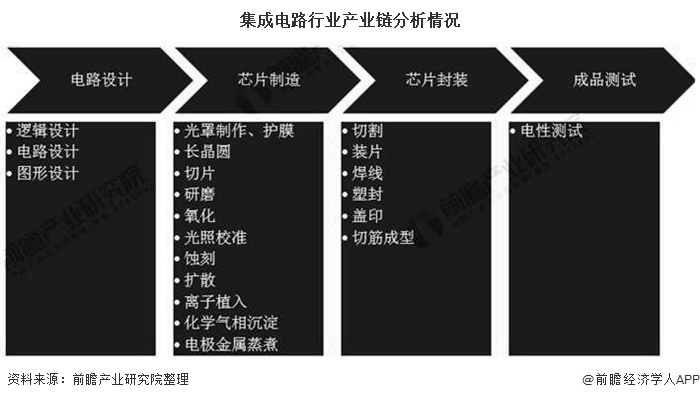 集成电路产业链分为电路设计、芯片制造以及封装与测试三个环节。近年来三个环节出现垂直分工的趋势,并已经发展成为独立电子行业,另外还形成了生产封装材料的集成电路支撑业。