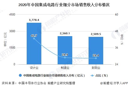 2020年,中国集成电路产业继续保持2位数增长,全年销售额达到了8848亿元,较2019年增长17%。其中,设计业销售额达到3778.4亿元,同比增长23.3%,仍是三业增速最快的产业,占总体行业比重为42.7%;制造业销售额为2560.1亿元,同比增长19.1%,占比为28.9%;封装测试业销售额2509.5亿元,同比增长6.8%,占比为28.4%。
