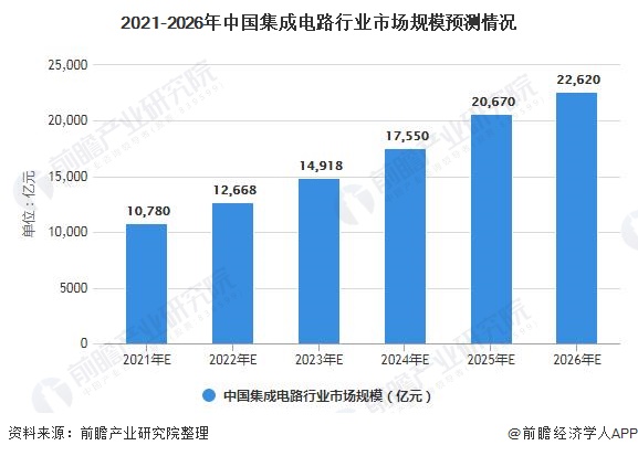 2010-2019年我国集成电路市场规模的年平均复合增速达到20%左右,整体来看,未来中国集成电路市场也将呈现快速发展的良好态势。前瞻初步预计未来五年我国集成电路行业市场规模保守保持12%的年平均复合增速,到2026年我国集成电路行业市场规模有望达到2万亿元左右。